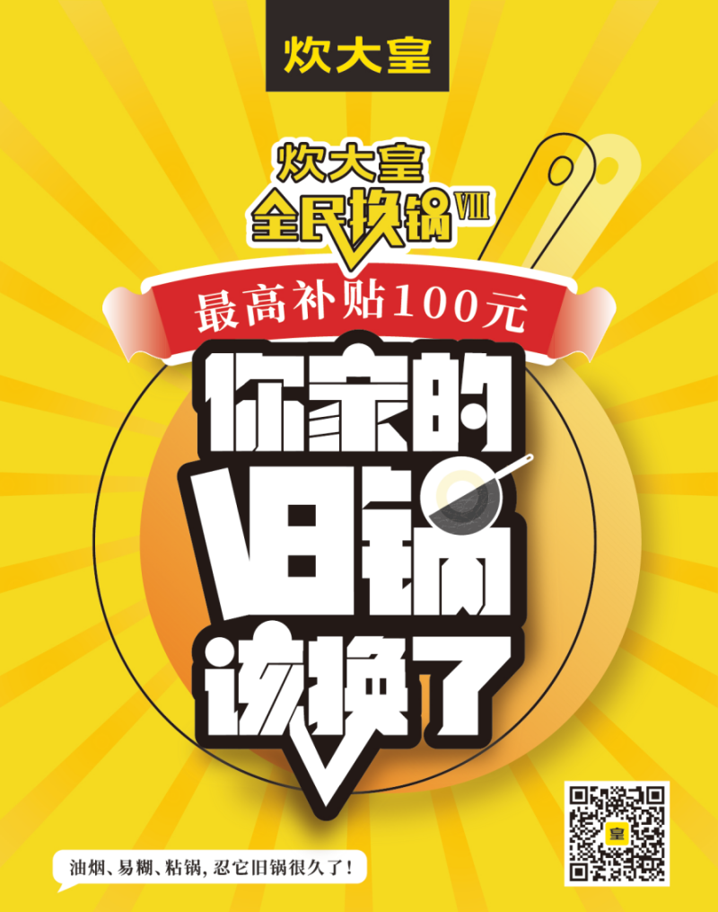 因此,为了更多家庭的身体健康,炊大皇推出“以旧换新,全民换锅”活动,倡议把家里满2年以上的旧锅或有损坏的锅进行及时更换。本次活动无限制、无套路,任何旧锅都能拿来直接抵扣钱换新锅!活动面向全国,线下各大商超的炊大皇零售点均可参与!