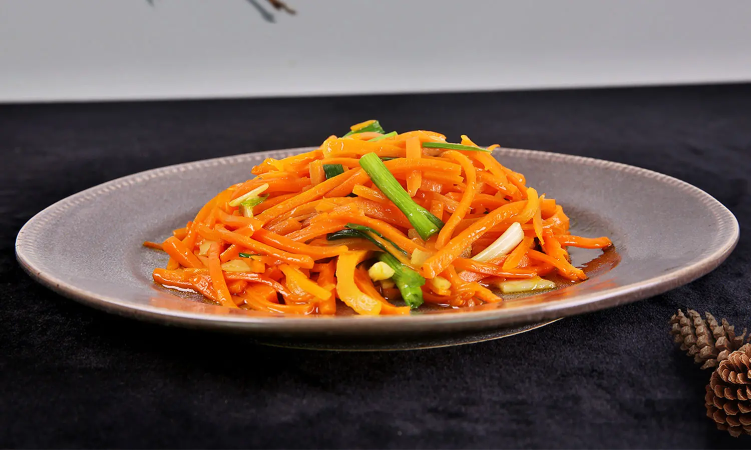 4. 胡萝卜丝炒至变软变色,加入葱段翻炒均匀即可